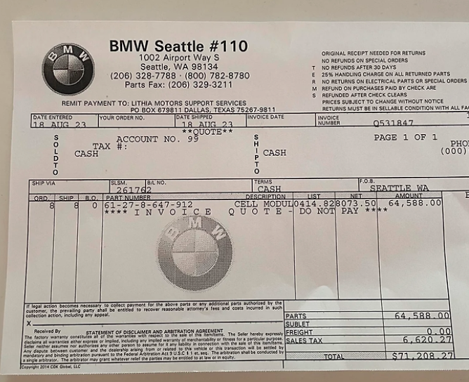 * 실제로 BMW 시애틀 딜러 견적서에는 i3 배터리셀 모듈 교체 비용으로 7만 1208.27달러(약 9,500만 원)가 청구(사진 참고)