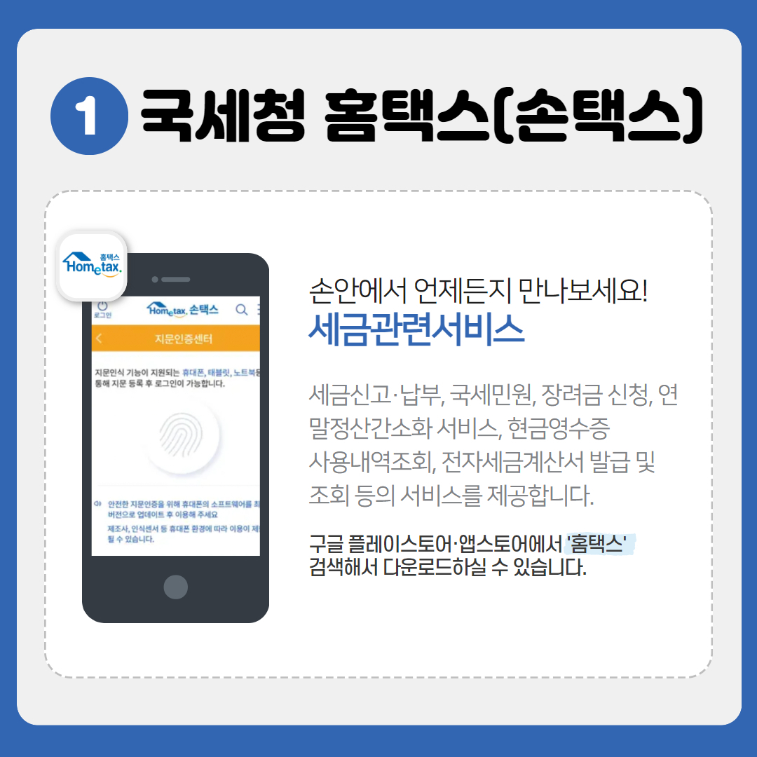 홈택스는 국세청에서 제공하는 세금 관련 서비스를 제공하는 공식 전자정부 누리집입니다. 내 손안에서 언제든지 세금 관련 서비스를 만나볼 수 있습니다.