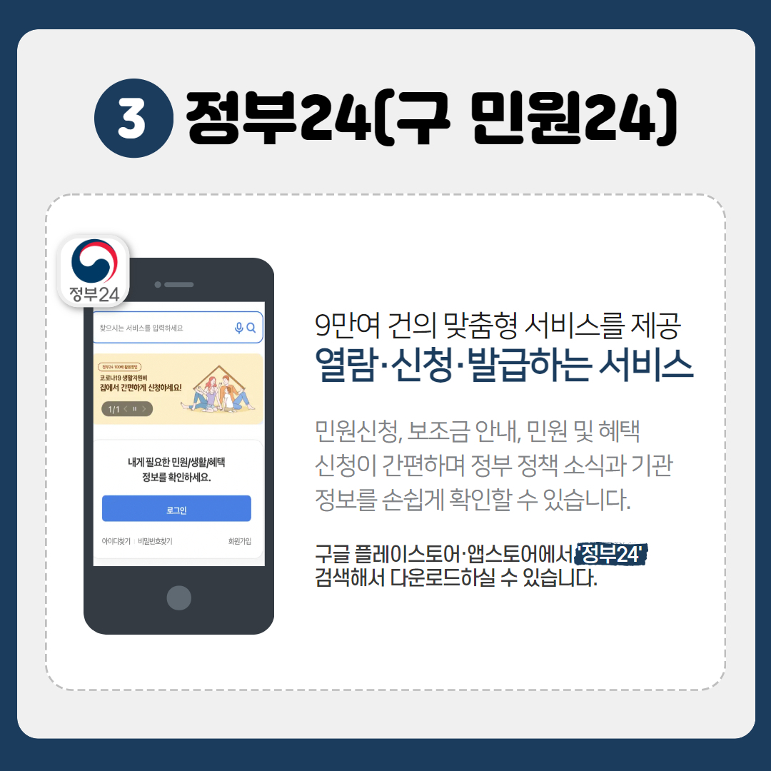 정부24는 정부의 서비스, 민원, 보조금24, 정책·정보를 통합 제공하는 대한민국 정부 대표 포털입니다. 민원신청, 보조금 안내, 민원 및 혜택 신청이 간편하며 정부 정책 소식과 기관 정보를 손쉽게 확인할 수 있습니다.