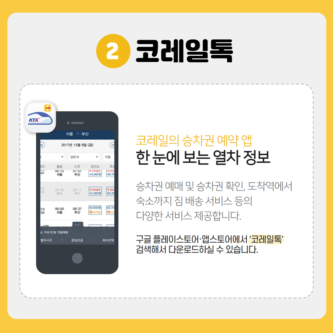 코레일톡은 한국철도공사의 코레일 승차권 예약 앱입니다. 승차권 예매 및 승차권 확인, 도착역에서 숙소까지 짐 배송 서비스 등의 다양한 서비스를 제공합니다.