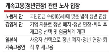 경영계는 사용자가 정년 폐지와 정년 연장 그리고 퇴직 후 재고용 중 하나를 선택할 수 있는 일본식 계속 고용 체제를 선호하고 있다고 합니다.
