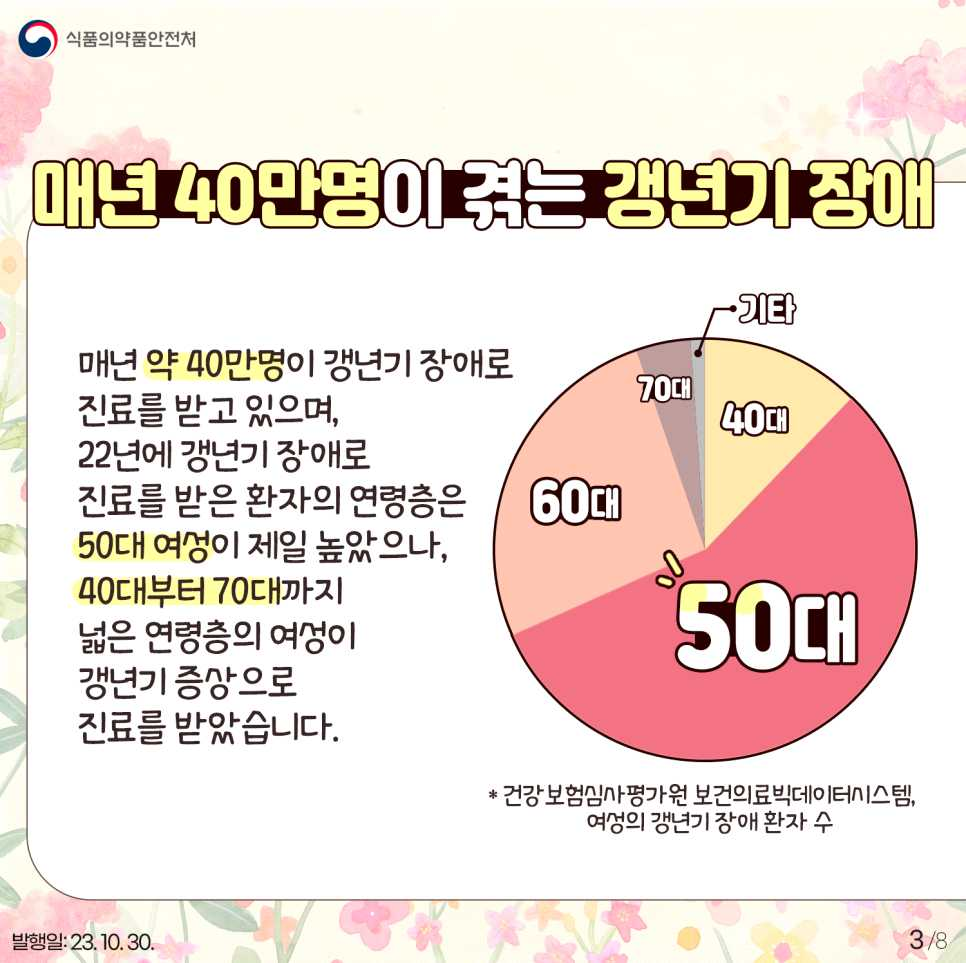 매년 약 40만 명이 갱년기 장애로 진료를 받고 있으며, 2022년에 갱년기 장애로 진료를 받은 환자의 연령층은 50대 여성이 제일 높았으나, 40대부터 70대까지 넓은 연령층의 여성이 갱년기 증상으로 진료를 받았습니다.