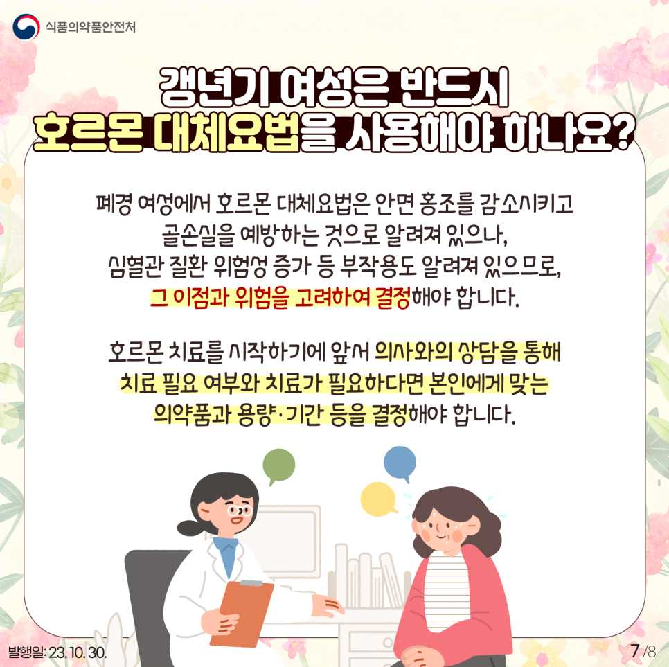 - 심혈관 질환자나 에스트로겐 의존성 종양 및 유방암 환자는 호르몬 대체요법을 받지 않아야 함