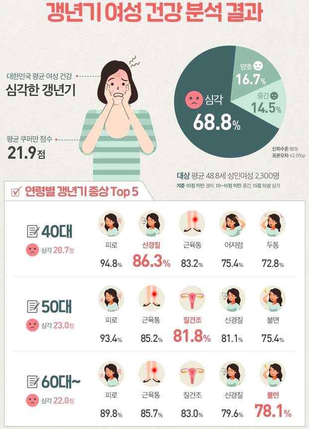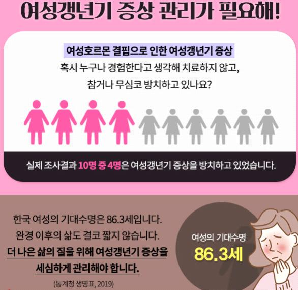 ☛ 갱년기 증상을 나이가 들면서 일반적으로 거치는 것이라고 치부하고 관리에 소홀하면, 골다공증, 뇌졸중, 관상동맥질환 등 만성 대사성질환으로 이어져 노년기 삶의 질이 크게 떨어질 수 있음
