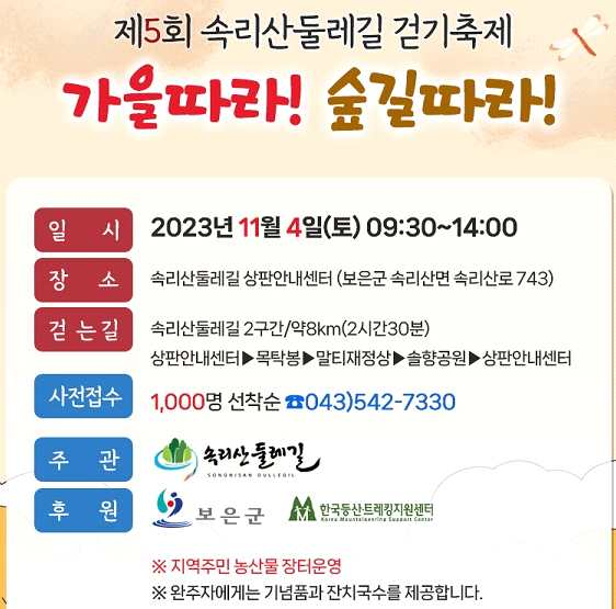 ▷ 참가 문의 : ㈔속리산 둘레길 사무국(☎ 043-542-7330)