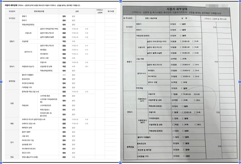 위 사진처럼 좌측에는 중고차 사이트에 있는 성능기록부이며, 우측은 차량을 보러 가서 판매자에게 요청한 성능기록부입니다. 확대해서 보시면 변속기에 누유라고 표시가 되어 있습니다.