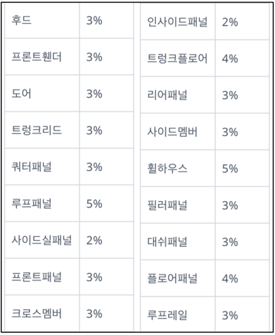 ② 차량 각 부위마다 차량가 액의 2~5% 단위로 지급