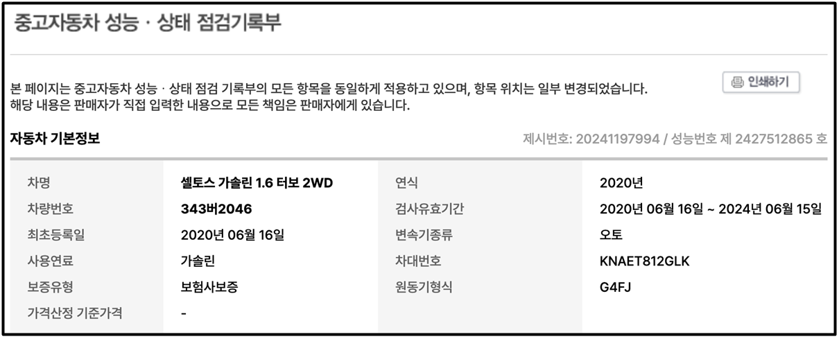 이렇게 하는 이유는, 중고차 사이트에 있는 성능기록부와 찾고자 하는 성능기록부의 내용이 다른 경우가 종종 있기 때문입니다.