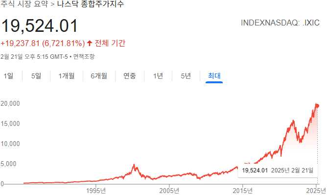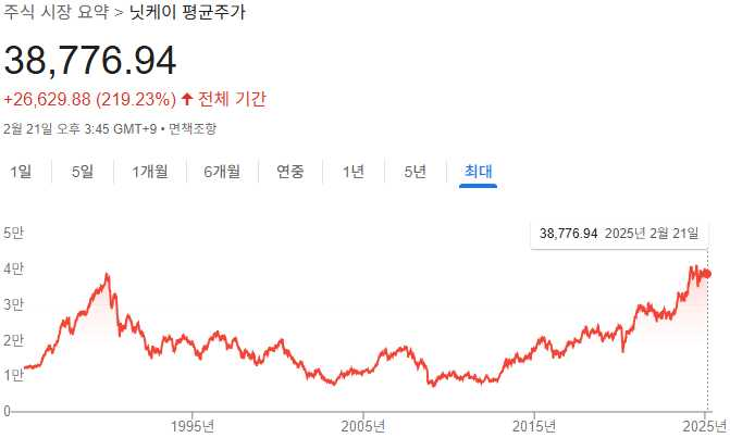 우리나라 유가증권시장에서 주요 기업 주식을 모아놓은 코스피 200의 최초 증시 개장 이래 2025년 2월까지의 지수를 미국과 일본의 대표 지수인 나스닥, 닛케이와 비교해 보겠습니다. 각 그래프마다 단위가 다르기 때문에 그래프의 기울기만 보아주시길 바랍니다.