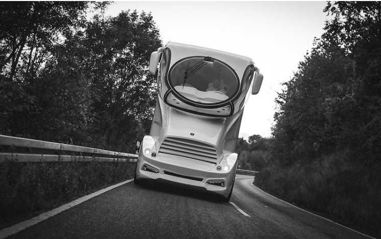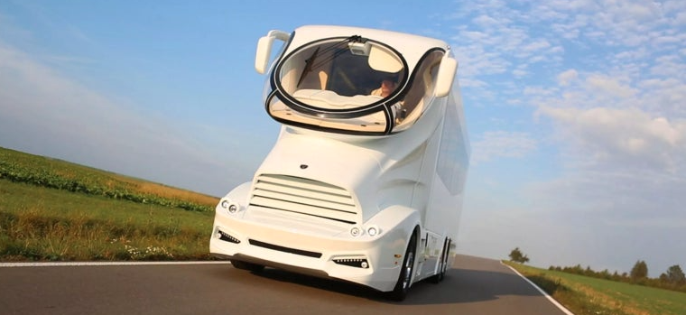 외관부터 압도적입니다. 곡선과 유선형 디자인, 미래지향적인 전면 유리, 그리고 일반 캠핑카에선 볼 수 없는 초대형 차체입니다.