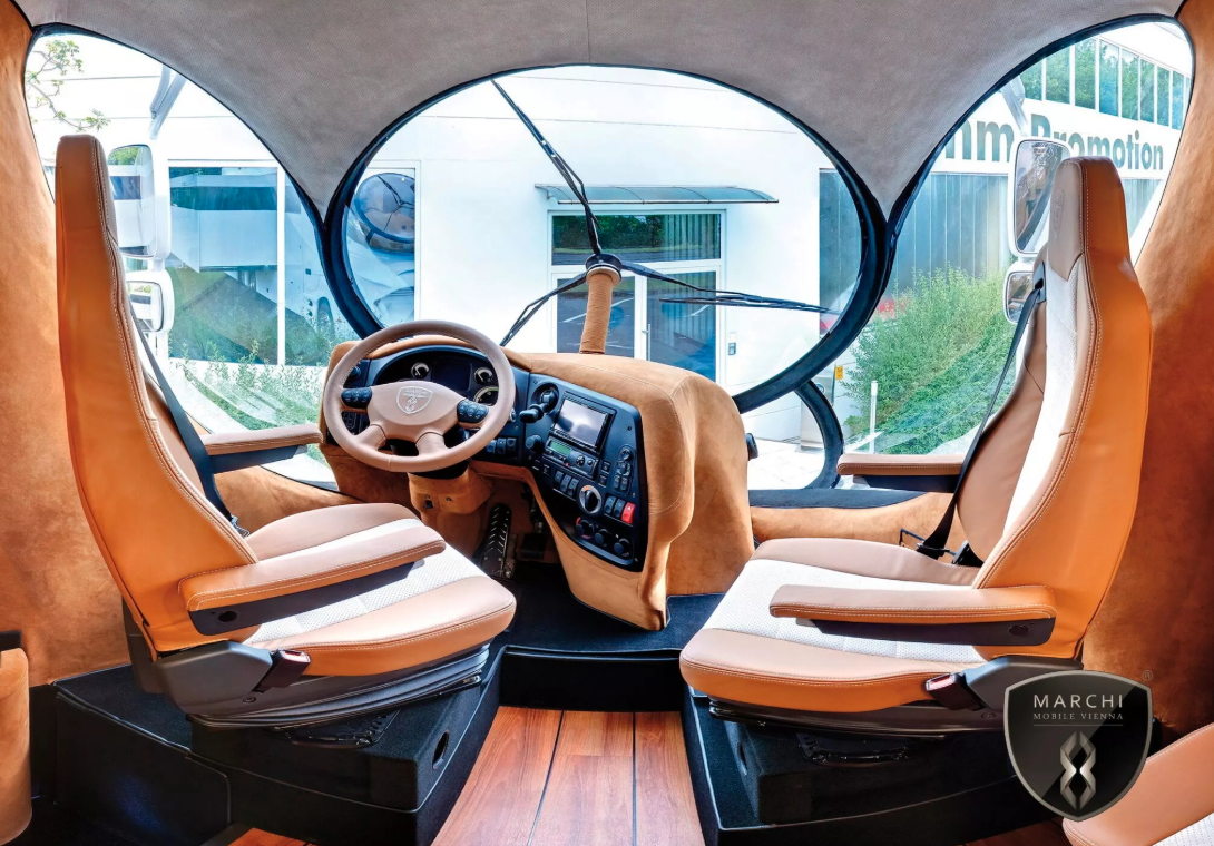 위성 TV, 초고속 인터넷이 기본 탑재되어 있어 이동 중에도 업무를 보거나 영화·드라마를 감상할 수 있습니다. 운전석은 항공기 조종석을 연상시키는 디자인으로, 디지털 계기판, 360도 카메라, 자동 주차 시스템, 운전자 맞춤형 안마 시트까지 갖추고 있습니다.