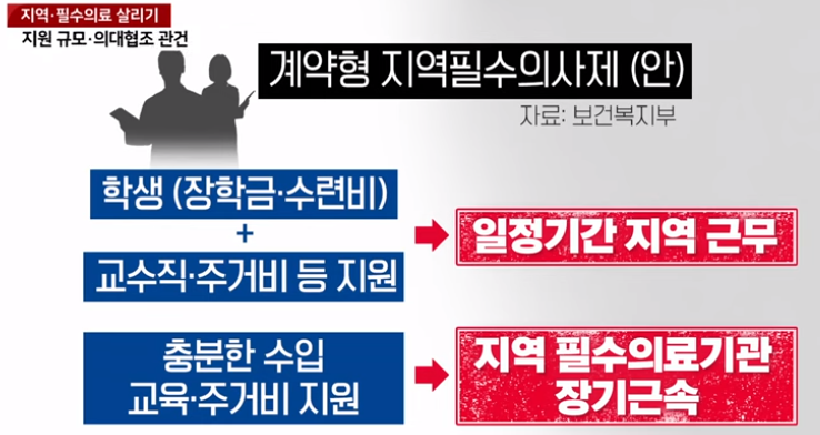 의대, 지방자치단체, 의대생이 계약을 맺어 장학금, 수련비용을 지원하는 대신, 지역에서 일정 기간 일하게 하는 '계약형 지역 필수의사제'를 도입하겠다고 했습니다.