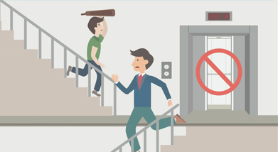 ② 건물 밖으로 나갈 때에는, 계단을 이용하여 신속하게 이동해야 하며 엘리베이터는 절대로 탑승하면 안 됩니다. 엘리베이터 안에 있을 경우에는, 모든 층의 버튼을 눌러 먼저 열리는 층에서 내려야 합니다. 건물 밖에서는 가방이나 손으로 머리를 보호하며, 건물과 거리를 두고 주위를 살피며 대피합니다.
