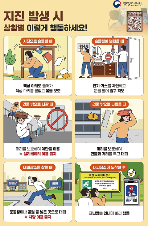 한편 행안부는 지진으로 흔들리는 동안은, 탁자 아래로 들어가 머리를 보호하고 탁자 다리를 꼭 잡는 등 지진 발생 시 국민 행동 요령을 전파했습니다.