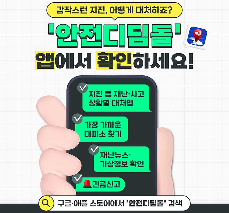 갑작스러운 지진, 여러분은 어떻게 대처하십니까? 잘 알지 못하신다면 이 기회에 '안전 디딤돌' 앱에서 한번 확인해 보실 것을 권해 드립니다.(구글·애플 스토어에서 '안전 디딤돌' 검색 및 설치)
