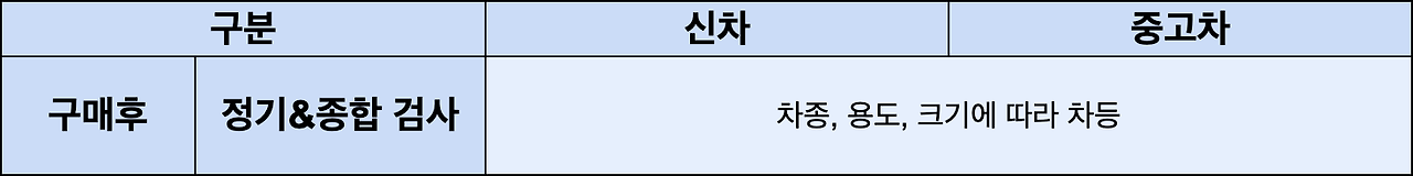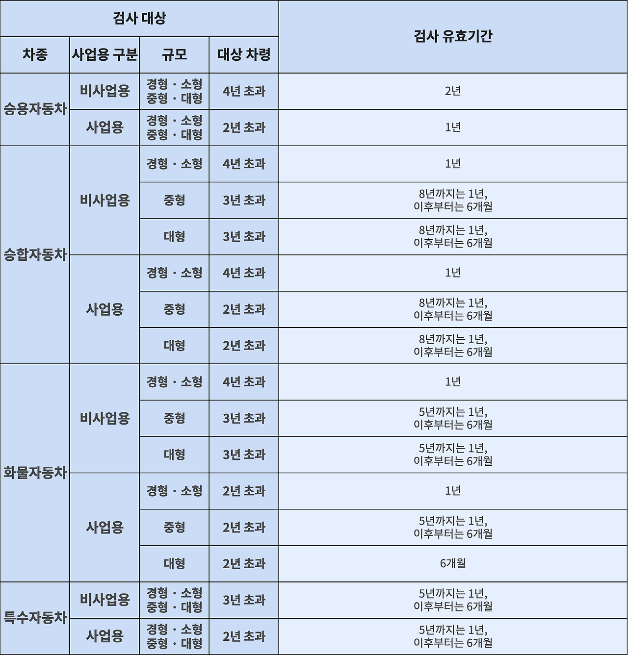 자동차 정기 검사는 자동차관리법에 따라 신규 등록 후, 일정 기간마다 정기적으로 실시하는 검사이며 검사 주기는 아래 표와 같습니다.