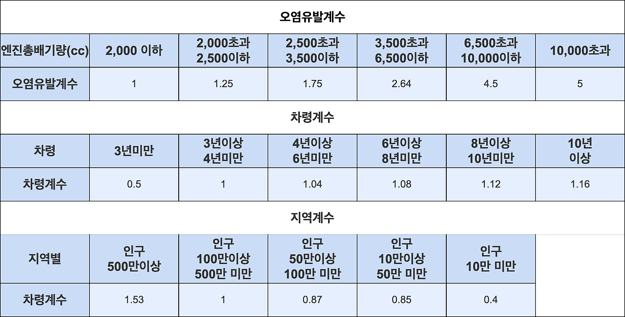 오염 유발 계수, 차령 계수 그리고 지역계수는 아래 표와 같습니다.