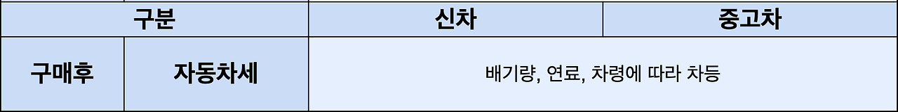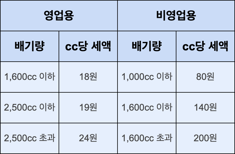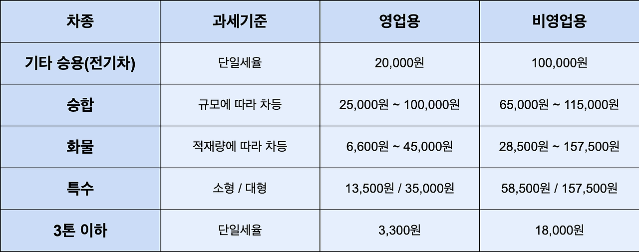 자동차세는 자동차의 소유에 대하여 과세하는 세금으로, 재산세적인 성격과 도로 손상 및 환경오염에 대한 부담금적 성격을 동시에 갖는 후불제적 세금이며, 아래 표와 같이 배기량, 연료별(전기차), 크기 및 용도에 따라 다릅니다.