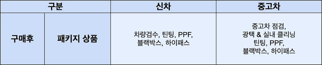 이러한 작업은 업체와 제품에 따라 가격이 다양하며, 신차 패키지 업체를 통해 원하는 모든 서비스를 한 번에 받을 수 있습니다.