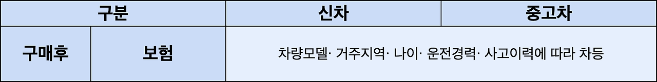 보험은 차량 구입 시 미리 가입해야 차량 등록 및 이전이 가능하고 1년마다 갱신해야 합니다. 보험료는 다양한 요소에 따라 달라집니다. 운전자 범위를 한정하는 특약(일인 한정, 부부 한정, 가족한정 등)에 가입하면 보험료를 10~30% 절약할 수 있습니다.