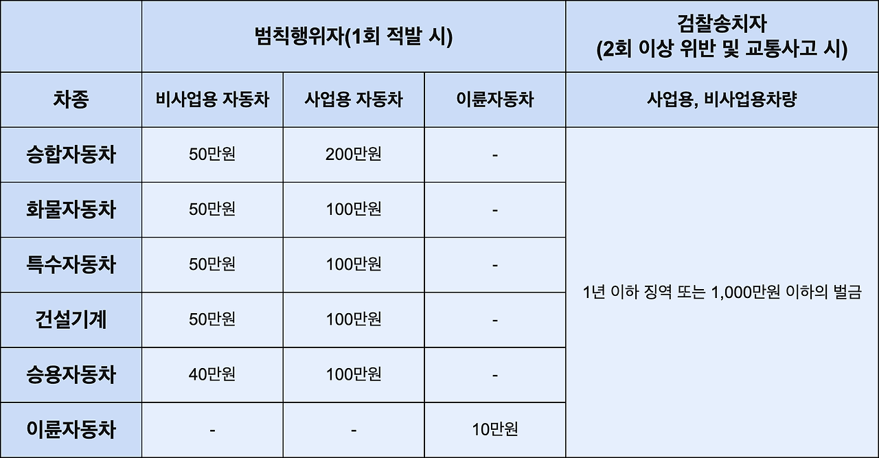 또한 무보험 차량 운행 시에는 아래 표와 같은 범칙금이 부과되고, 장기간 보험 미가입 시 번호판 영치될 수 있습니다.