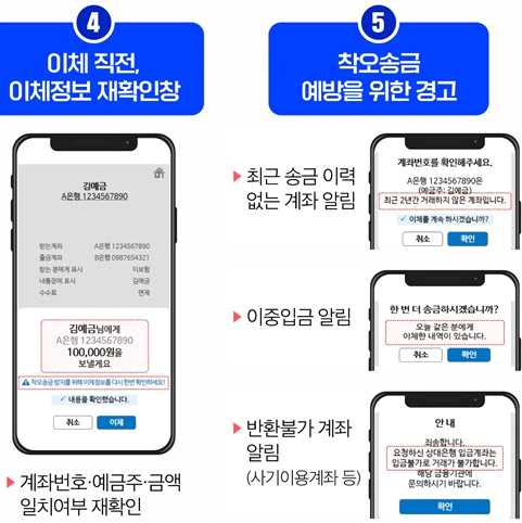 또한 모바일뱅킹 및 간편 송금 관련 앱의 착오 송금 예방 기능 강화가 필요합니다.
