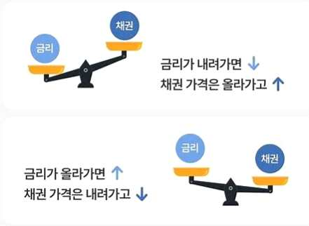 일반적으로 채권 금리(수익률)와 채권 가격은 반대로 움직입니다. 채권 금리가 오른다는 건 채권 가격이 떨어진다는 뜻이고, 채권 금리가 떨어진다는 건 채권 가격이 올라간다는 것을 뜻합니다.