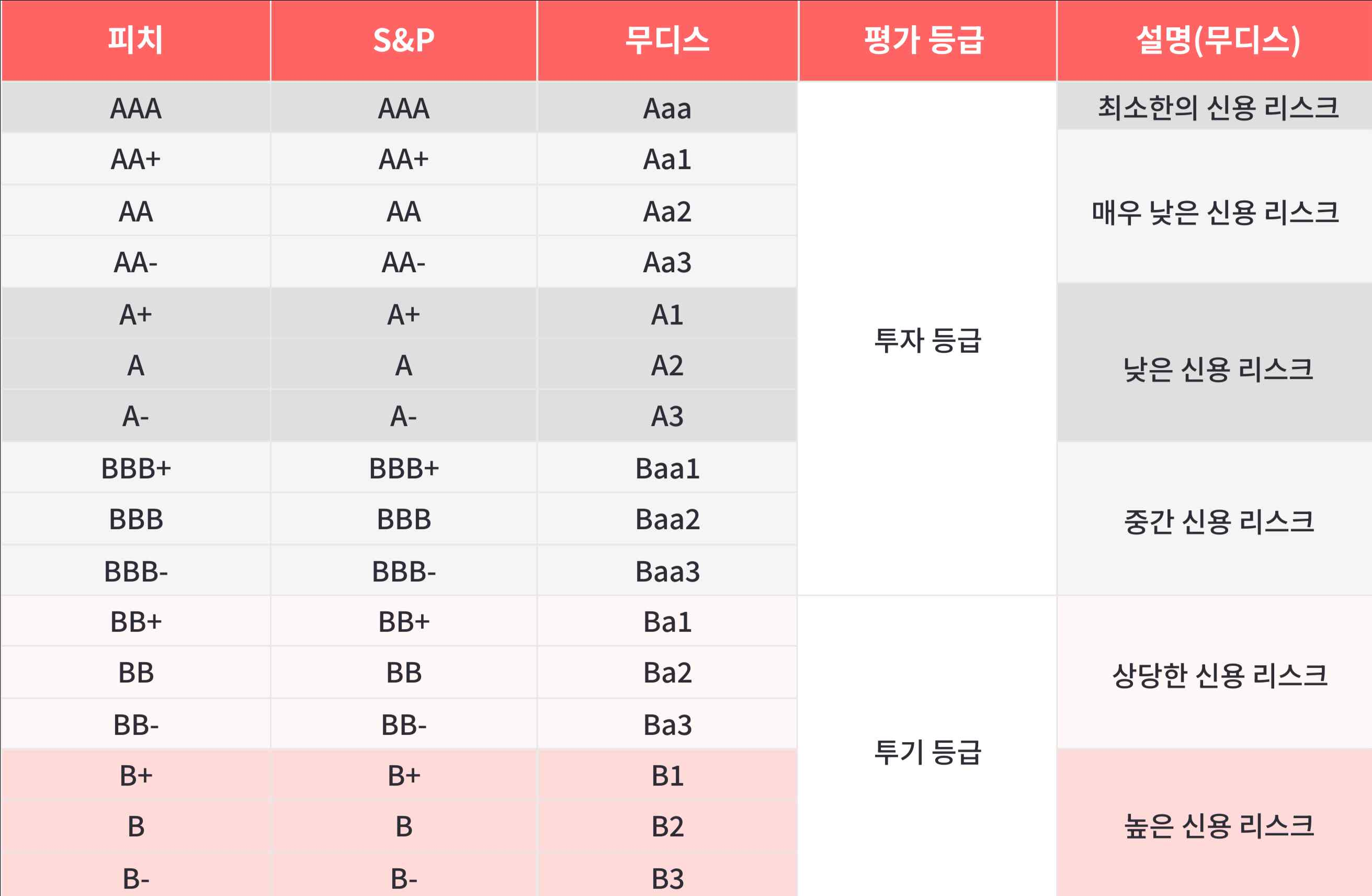 그래서 채권발행자의 신용도를 객관적으로 판단하기 위한 신용등급이 존재합니다. 신용평가사는 기업의 채무상환 능력을 평가해서 채권발행자의 신용위험에 등급을 부여합니다.