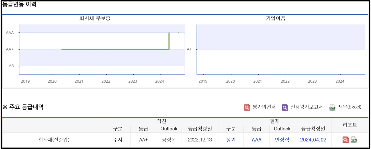 따라서 개별 채권에 투자할 때는 해당 채권의 신용등급을 꼼꼼히 점검하고, 가능하면 해당 회사의 신용등급이 과거에 어떻게 변해왔는지 추이도 확인하는 것이 좋습니다.