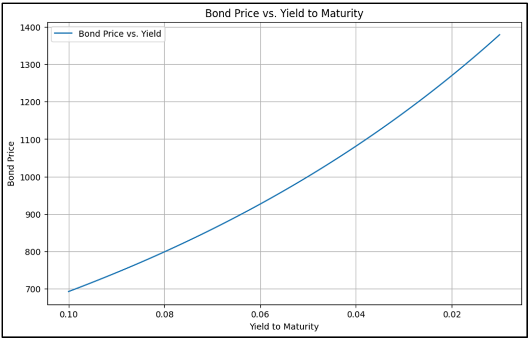 만기가 일정할 때, 채권 수익률 하락으로 인한 가격 상승 폭이, 같은 폭의 채권 수익률 상승으로 인한 가격 하락 폭보다 커집니다. 5년 만기 채권의 수익률이 10%에서 15%로 상승했을 때, 채권 가격은 17.37% 하락합니다.