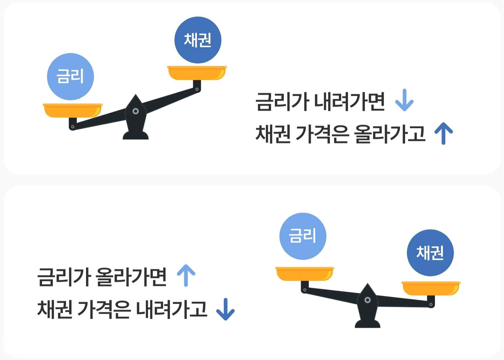 채권 금리에 의해 결정되는 채권 수익률과 채권 가격은 역의 관계입니다. 채권 수익률이 상승하면 기존에 발행된 채권 가격이 하락하고, 채권 수익률이 하락하면 기존에 발행된 채권 가격이 상승합니다.