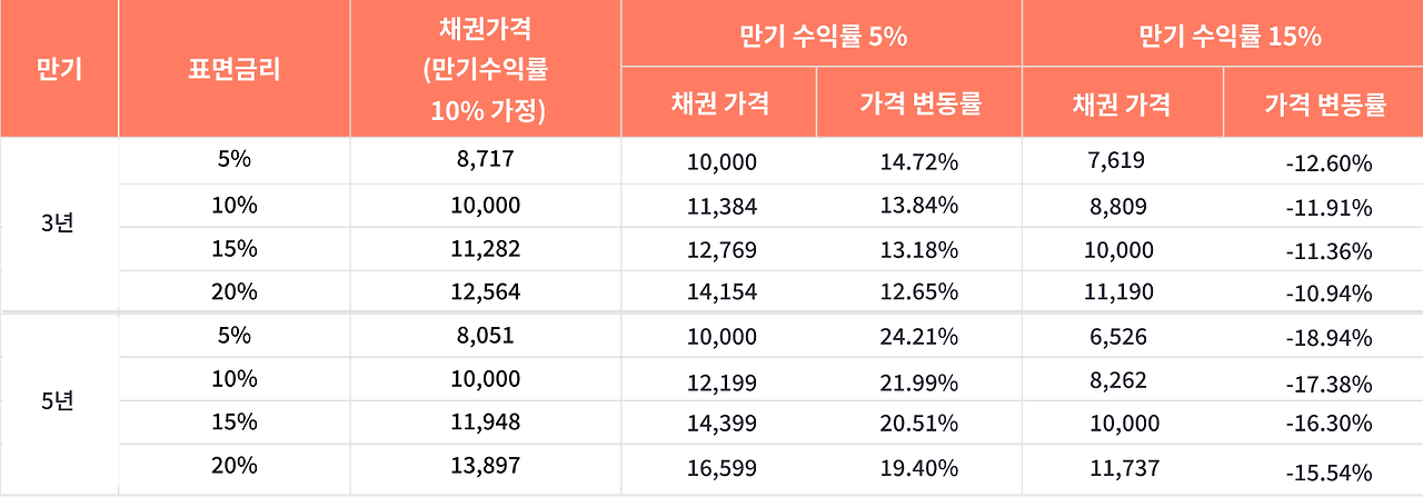 채권의 만기 수익률이 표면금리와 동일한 10% 일 때, 채권 가격은 액면가 10,000원입니다. 하지만 만기 수익률이 5%로 하락하면, 채권 가격은 10,000원에서 11,384원으로 상승합니다.