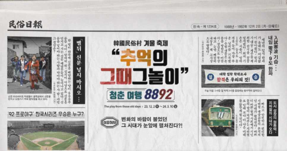 한국민속촌은 X세대가 등장하는 추억의 겨울 축제 '청춘 여행 8892'를 2023년 12월 2일(토)부터 2024년 3월 10일(일)까지 진행합니다.