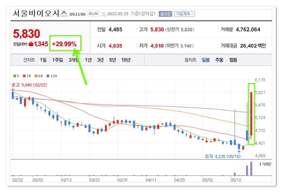 * 상한가 : 주식의 가격이 하루 동안 상승할 수 있는 최대한도를 의미합니다. 우리나라 주식시장 상한가는 전일 종가의 30%로 제한됩니다.