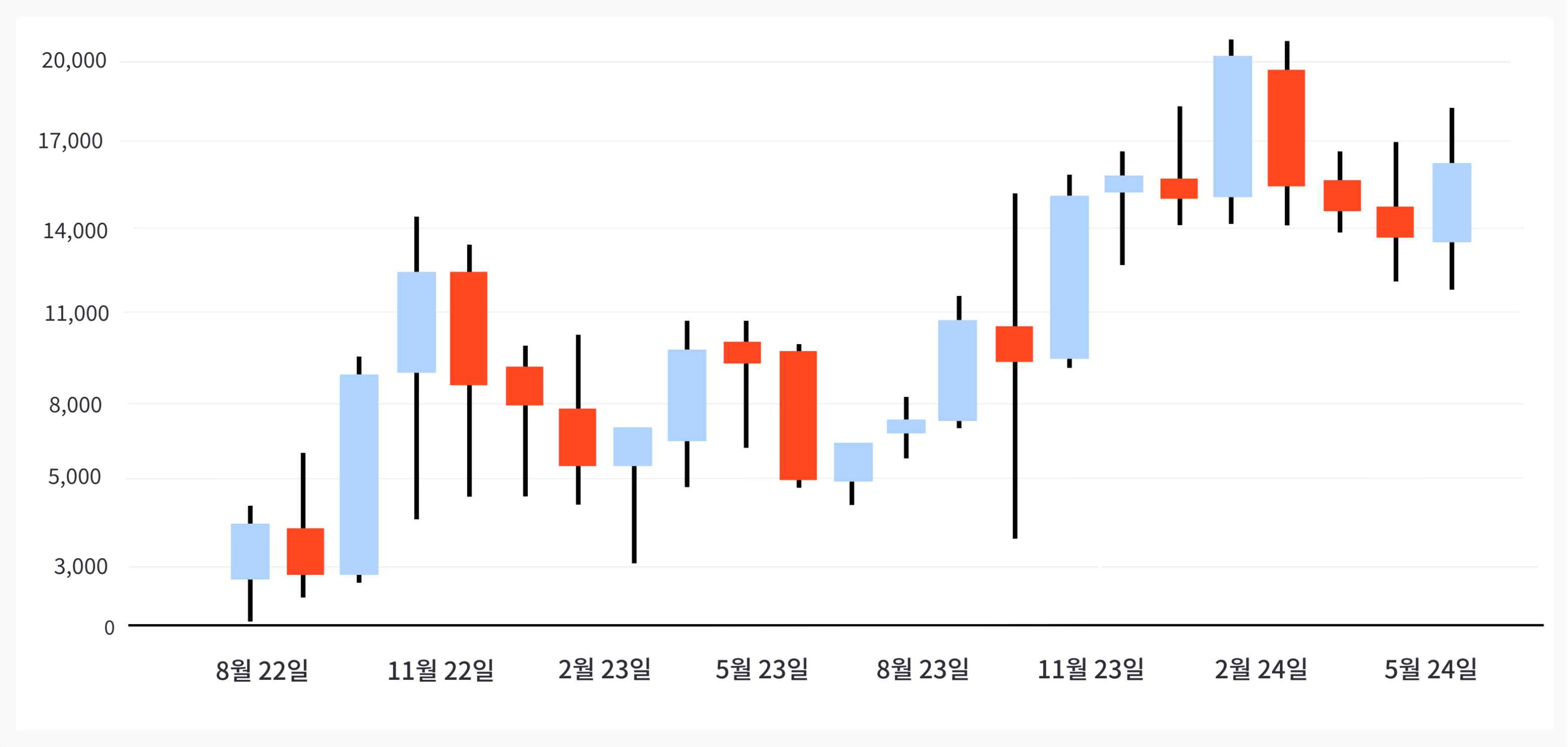 - 시가 : 해당 기간의 거래가 시작된 가격, 종가 : 해당 기간의 거래가 마감된 가격