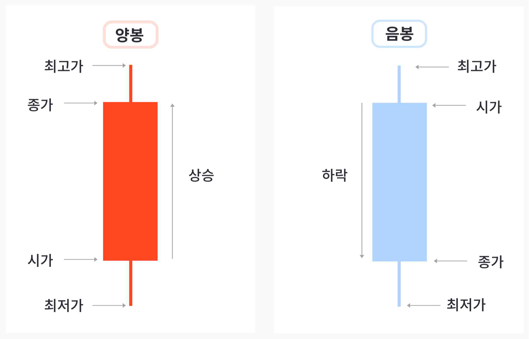 - 음봉 : 시가보다 종가가 낮은 경우로, 주가가 하락했음을 나타냅니다. 일반적으로 검은색이나 파란색으로 표시됩니다.