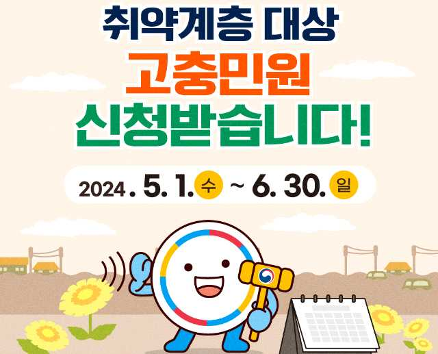 오는 6월 30일까지 저소득층, 고령자, 장애인, 소상공인 등 고충민원에 대한 접근성이 낮은 취약계층을 대상으로 '고충 민원 집중신청' 기간이 운영됩니다.
