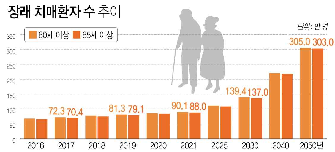 같은 기간 471만 6,000명인 치매 환자는 2035년엔 565만 5,000명으로 늘어날 전망이라고 합니다. 일본에선 65세 이상 인구의 10~13%가 치매라고 알려졌습니다. 일본의 고령자 열 명 가운데 한 명은 치매인 것입니다.