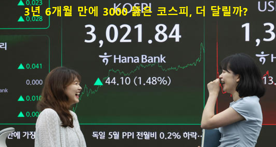 2021년 12월 이후 최고치 찍은 코스피(KOSPI)가 3000선을 돌파하며 급등세를 이어가고 있습니다. 한국거래소에 따르면 지난 20일 코스피는 전장 대비 1.48% 오른 3021.84에 마감하면서, 2021년 12월 이후 3년 6개월 만에 최고치를 찍었습니다.