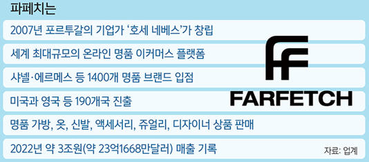 파페치는 전 세계 190여 개 나라에 진출한, 연 매출 3조 원에 달하는 명품 의류 · 잡화 전문 온라인 쇼핑 플랫폼입니다. 1,400여 개 브랜드가 입점해 있는데, 여기엔 샤넬 · 에르메스 등도 있어요.