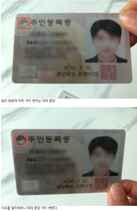 3) 좌측 하단의 작은 사진이 보는 각도에 따라 이미지와 숫자(생년월일)가 번갈아 나타나는지 여부 확인