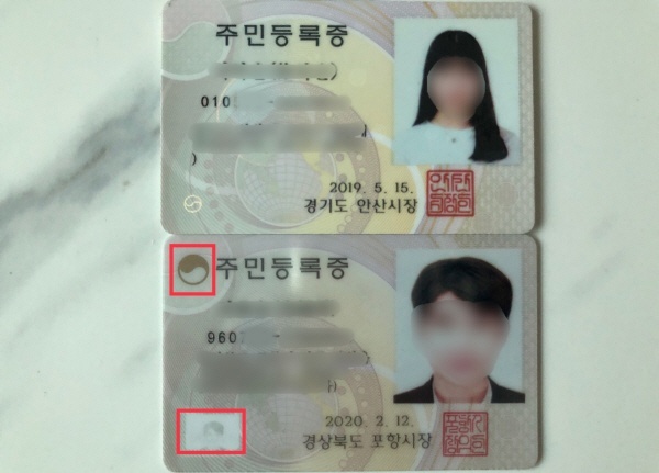 1) 성명과 주민등록번호 부분이 돋움 처리됐으므로, 만져보고 오돌토돌한 촉감이 있는지 여부
