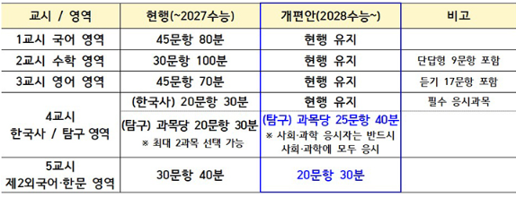 교육부와 평가원은 수능 시험 시행의 안정성과 대입전형 활용도 등을 종합적으로 고려하여 2028학년도 수능부터 적용되는 영역별 문항 수 및 시험시간, 성적통지표 양식을 다음과 같이 확정발표 했습니다.