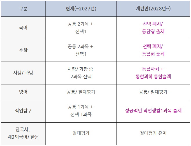 2028학년도 대학입시제도 개편안(2023.12.)에 따라 2028학년도 수능부터 국어, 수학, 탐구 영역의 선택과목이 폐지되는 통합·융합형 수능이 시행됩니다.