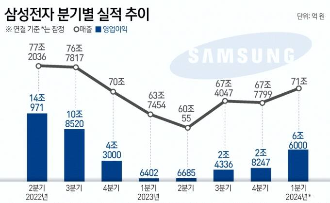 2024년 1분기 '삼성전자'의 실적은 매우 긍정적이었습니다. 삼성전자는 매출 71.92조 원, 영업이익 6.61조 원을 기록했습니다. 이는 2023년 4분기 분기 대비 매출이 6% 증가하고, 영업이익이 3.78조 원 증가한 수치입니다.