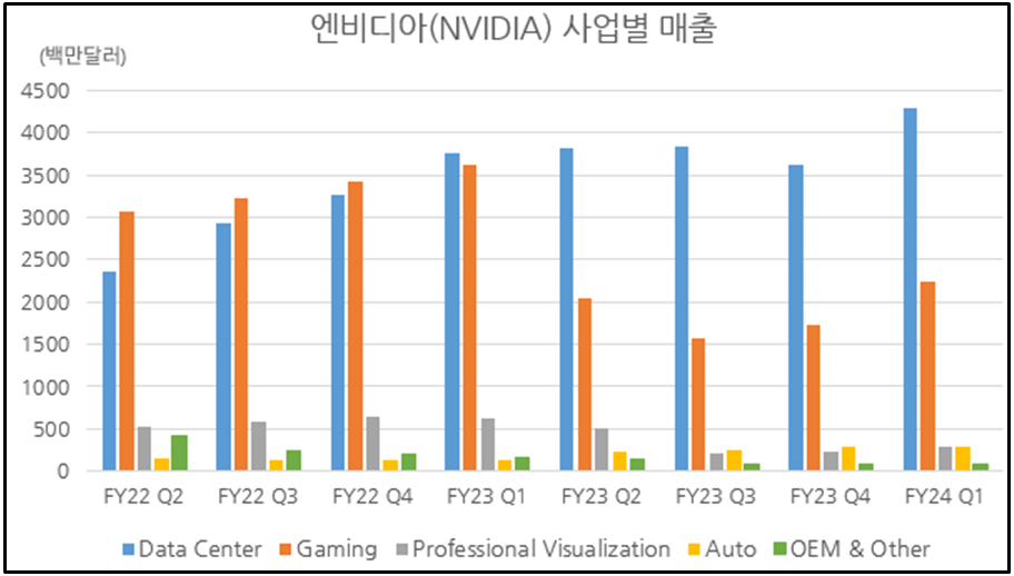 '엔비디아'는 2024년 1분기 동안 매출 260억 4,400만 달러를 기록했으며, 이는 전년 동기 대비 262% 증가한 수치입니다. 주요 성장 요인으로는 AI 및 데이터센터 수요 증가가 꼽힙니다.