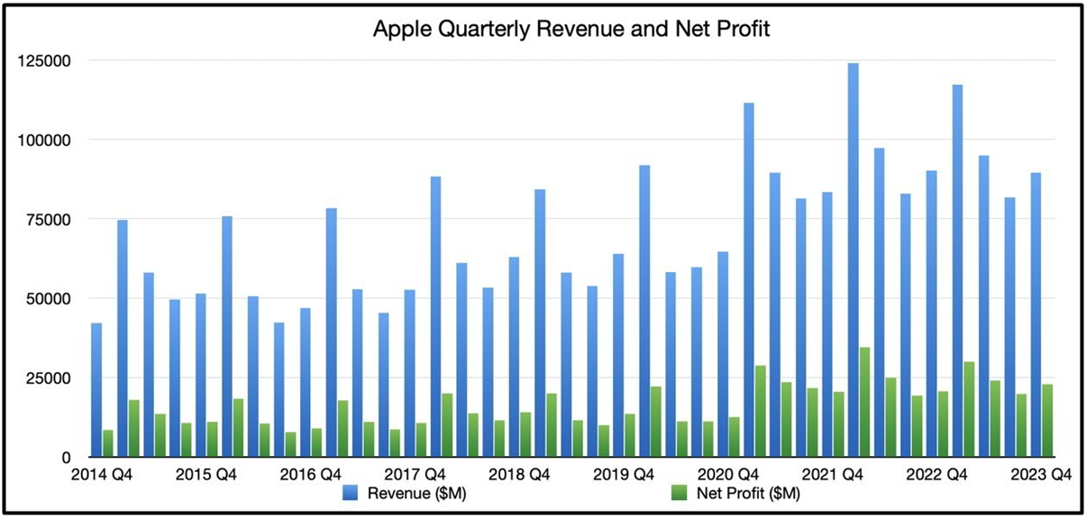 '애플'은 2024년 1분기 동안 매출 1,196억 달러, 희석 주당 순이익 2.18달러를 기록했습니다. 이는 전년 동기 대비 매출이 2% 증가하고, 주당 순이익이 16% 증가한 수치입니다. 주요 성장 요인으로는 iPhone 판매량 증가와 서비스 매출의 역대 최고 기록이 꼽힙니다.