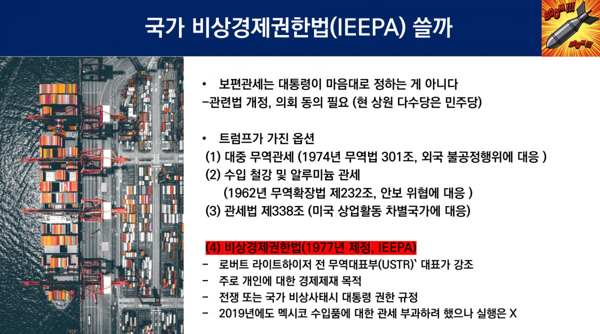 미국의 안보·경제 등에 위협이 되는 국가비상사태가 발생했을 때, 대통령이 무역 등 경제 활동을 통제할 수 있도록 한 '국제경제 비상 권한법(IEEPA)'에 따라 관세를 부과한 거라고 합니다.