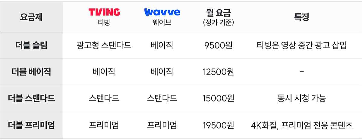 더블 이용권 요금제 종류로는 ▲더블 슬림(티빙 광고형 스탠더드+ 웨이브 베이직), ▲더블 베이직(티빙 베이직 + 웨이브 베이직), ▲더블 스탠더드(티빙( 스탠더드+ 웨이브 스탠더드)) 그리고 ▲더블 프리미엄(티빙 프리미엄 + 웨이브 프리미엄)으로 구성되어 있습니다.