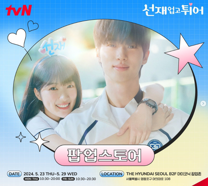 tvN 드라마 '선재 업고 튀어'가 인기에 힘입어 팝업스토어를 진행합니다. tvN 드라마 측은 지난 17일 공식 SNS 등을 통해 오는 5월 23일(목)부터 29일(수)까지 서울 영등포구 여의대로 현대백화점 더현대 서울 B2F 아이코닉 팝업존에서 팝업스토어를 개최한다고 밝혔습니다. MD 품목은 후추 공개될 예정이라고 합니다.